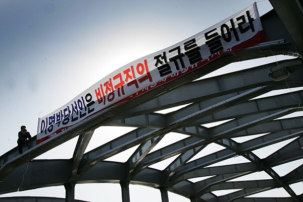 고공농성은 사회 쟁점을 만들고자 시작한 일이었다. 경기도 인천시의 한 구석에서 벌어지는 이 "부당하고 억울한" 일을 사람들에게 알려, 공장 안으로 돌아가고 싶었다. 물론 고공농성만 한 것은 아니었다. GM대우비정규직지회는 한강대교에도 올라갔고, 마포대교 난간에 밧줄에 몸을 기대 '하상(河上) 시위'도 해 봤다. (☞관련 기사 : GM대우 비정규직 3번째 '하늘시위', "MB가 칭찬한 '노사화합' GM대우의 실상을 보라")