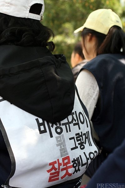 28일 서울 여의도 산업은행 앞, 5월 1일 노동절을 앞두고 비정규·투쟁사업장 공동투쟁단이 "4말5초 집중투쟁"을 선포하는 자리. "비정규직이 뭘 그렇게 잘못했나요"라고 쓰여 있는 등허리는 봄햇살에도 시리다.