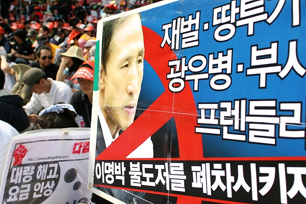 이명박 정부 들어 처음 맞은 노동절 기념대회에 임하는 이석행 민주노총 위원장은 비장했다. "대회사를 읽으려고 준비해 왔지만 이명박 정권은 노동자의 생일인 이날 그마저도 허용하지 않고 있다"며 시작한 대회사였다.