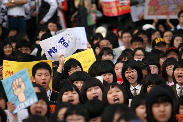 어떤 어른이 제 발로 하나 둘 모인 이들을 "아무것도 모르는 아이들"라 할 수 있을까. 멀리 강화에서, 안산에서, 파주에서 왔다는 아이들은 저마다 이명박 대통령에게 하고 싶은 말을 하나씩 품고 청계천 광장을 찾았다. 그들을 바라보는 어른들도 같이 촛불을 높이 들었다. 3일 청계천에서 그들은 모두 하나였다.