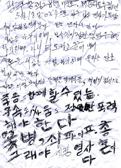 "광주항쟁 28년, 미친소 MB타도 투쟁 1년, 이름 없는 전사가 투쟁으로 이제 망월묘역에 갔다. 오늘 난 다시 간다. 세상을 바꾸기 위해, 아니 타도하고 끌어내어 새로운 세상을 건설하기 위해 우리는 단호히 맞서야 한다. 지금 어영부영하는 단체들, 관계자들, 혁명의 정신으로 죽음도 함께 할 수 있는, 구속도 싸움도 정당한 폭력 (투쟁도) 해야 한다. 꽃병·쇠파이프. 그래야 진정 열사 혼이다."