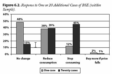 왼쪽 그래프는 미국에서 광우병 소가 1건이 발생했을 경우와 20건이 발생했을 경우를 가정한 소비자들의 미국산 쇠고기 구입 반응이다. 1건 발생의 경우 12%만이 미국산 쇠고기 구입을 중단하겠다는 반응을 보였으나(회색 막대) 20건의 광우병이 발견되었을 경우 45%는 구입중단을 38%는 구입을 줄이겠다는 반응을 보였다(검은 막대).