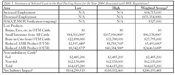 미국은 간단히 말해 인간 먹을거리 체계에서 광우병 위험요소를 배제하지 못하는 동물성 사료 산업을 유지한 채 미봉책만을 되풀이 하고 있을 뿐이다. 왜인가? 세계 곡물 교역량의 90% 즉 사료시장을 장악하고 있는, 동시에 미국 쇠고기 시장의 80% 이상을 장악하고 있는 카길, ADM, 타이슨, 스위프트-콘아그라 등의 거대 농식품 기업의 이윤 때문이다. 동물성 사료는 이 거대 기업체들이 쓰레기로 버려야할 소나 돼지의 비식용 부위를 다시 사료로 재활용할 수 있는 저렴한 단백질사료이고 따라서 쓰레기 처리 비용을 줄이는, 이들 말을 빌면 "비용효과적인" 단백질 사료다. 오른쪽 표는 미국 캔자스 주정부에 제출된 보고서에서 인용한 내용으로 각각의 사료 제한 정책에 따른 비용을 계산한 것인데 이 표를 보면 유럽 수준으로 모든 농장 동물에게 동물성 사료를 금지하면 소 한 마리당 24.6달러가 더 든다. 결국 이 돈을 위해 미국 국민과 또 이를 수입하는 아시아 국민들이 광우병 위험을 감수해야 하는 것이다.