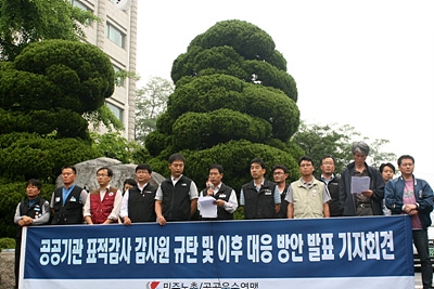 공공운수연맹은 이날 "독립적 지위를 갖고 공공기관의 비리를 캐 진정한 개혁을 이룰 수 있는 감사라면 당연히 해야하겠지만, 감사원이 계속 정치적 목적을 가진 감사를 강행한다면 부당한 감사에 대한 법적 조치를 강구하겠다"고 밝혔다.