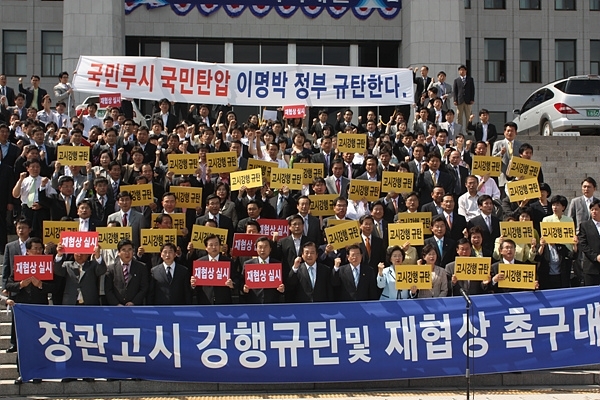 손학규 대표는 이날 규탄대회에서 "이명박 대통령과 정부는 국민하고 무얼 갖고 싸운다는 것인가? 국민의 생명과 안전을 갖고 국민에게 선전포고를 하겠다는 것인가?"라며 "도대체 이 정부가 누구를 위한 정부인지 알 수 없고 답답하고 통탄스럽다"고 비난했다.