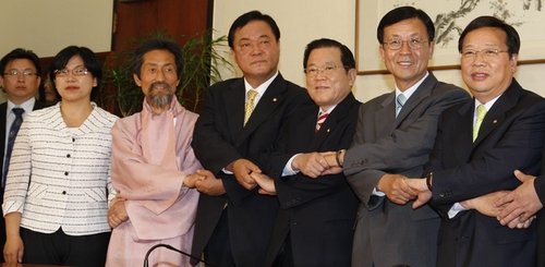 야 3당 원내대표와 정책위의장은 30일 오전 국회에서 회동을 갖고 고시 무효 소송을 제기하기로 합의한 한편 이날 오후 이명박 대통령이 귀국하는 대로 야 3당 대표들과 긴급 정치회담을 열 것을 요구하기로 했다.