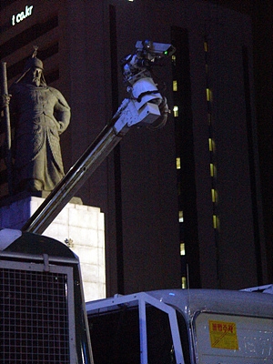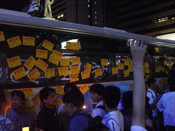 ○…불복종의 줄다리기 한 판. 광화문 네거리 이순신 동상 앞에 겹겹이 쌓여 있던 경찰 버스에 시민들이 밧줄을 매고 한 두 대 씩 끌어내기 시작했다. 경찰은 "경찰 버스 탈취는 중대한 불법행위"라고 거듭 경고했지만, 시민들은 불복종으로 맞섰다. 오히려 경찰 버스에 시민들이 자체 제작한 '불법주차' 스티커를 덕지덕지 붙인 뒤 "불법 주차 버스는 시민의 힘으로 견인한다"며 수백 명이 밧줄에 달라붙어 한 밤의 줄다리기를 펼쳤다. "의쌰, 의쌰" 구호와 함께 "이명박은, 물러가라"를 두 박자로 외치기도 했다. 시민들은 쇠고기 재협상 요구에 꿈쩍하지 않고 어설픈 사과 담화문을 내놓은 이명박 정권에 대해 '가두 시위' 정도는 불법이라고 인정하지 않는 분위기였고, 1일 새벽의 물대포와 의경의 군홧발에 여학생의 머리가 짓이겨지는 모습을 보고 난 뒤에는 경찰 버스는 그저 '불법주차 차량'일 뿐이었다.