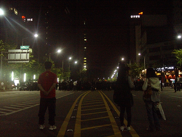 ○…저긴 뭔데 경찰버스가 저렇게 많아요? 31일 밤 광화문 세종로가 뚫렸다. 그런데 차선의 절반만 뚫렸다. 동쪽 절반 차선은 수십 대의 경찰 버스와 병력으로 가득 메워져 있었다. 서쪽 차선을 걸으며 경복궁 쪽으로 향하던 한 40대 남성이 기자에게 물었다. "저긴 뭔데 경찰이 저렇게 많아요?", "미국 대사관입니다", "아 그래요." 그 남성은 관심없다는 듯 '청와대로 가자'며 달려갔다. 한나라당이나 일부 보수세력은 '반미'로 변질되고 있다는 우려를 나타냈으나, 이번에 거리에 나선 시민들은 미국에는 관심이 전혀 없어 보였다. 오로지 목표는 청와대와 이명박 대통령이었다.