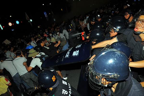 특히 1일 새벽 진압 과정에서 경찰의 군홧발에 여학생이 머리를 짓이기고 차이다 간신히 버스 밑으로 숨는 동영상과 물대포에 직사로 맞은 한 남학생이 그대로 꼬꾸라져 중상을 입는 영상이 TV와 인터넷을 통해 퍼지면서 시민들의 분노가 더욱 거세지고 있다. 지난 31~2일 새벽까지 기자가 목격한 모습들을 모아 봤다.