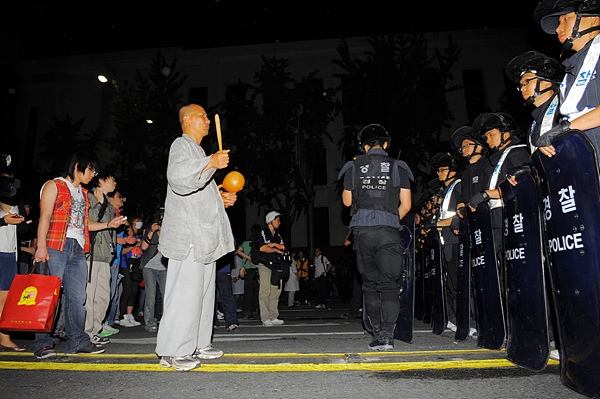 ○…경찰의 무력 앞에서는. 이렇게 맞서던 시민들이었지만 경찰의 막강한 무력 앞에서는 비무장한 시민들은 속수무책이었다. 경찰을 막아보겠다고 인근 보도 공사장의 펜스를 갖다 쳐봤지만 순식간에 무너졌고, 한 부부가 유모차로 경찰을 막아보겠다고 했지만 경찰은 순식간에 유모차를 돌아가 시민들을 밀어내기 시작했다. 경찰은 1단계로 광화문 네거리를 점령했고, 차례차례 밀고 나와 시민들을 인도로 밀어냈다. 전날 과잉진압 논란 때문에 이날은 물대포를 사용하거나 하지 않았지만 여전히 방패 날을 치켜 세워 시민들을 공격하는 경찰이 상당수 눈에 띄었다. 이 과정에서 한 여대생이 이가 부러지고 코뼈가 주저 앉는 중상을 입어 병원 응급실로 급하게 후송되는 모습이 <프레시안> 기자의 눈에 목격됐다.
