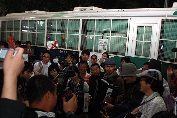경찰이 얌전하면 촛불시위도 평화로운 축제가 된다는 점을 일깨웠다. 길이 막힌 사람들은 광화문 사거리에서 저마다의 방식으로 축제를 '즐겼다'. 삼삼오오 둥그렇게 모여앉아 촛불을 앞에 두고 노래를 부르거나 정부에 하고 싶은 말을 구호로 압축해 외치기도 했다. 저지선 너머에 있는 미국 대사관을 향한 "버시바우 물러나라"라는 구호도 눈에 띄었다. 버시바우 대사는 이날 '재협상 불가' 입장을 확인했다.