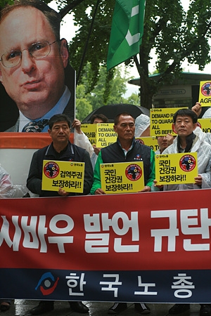 이미 두 차례의 성명을 통해 정부에 쇠고기 수입 재협상을 촉구한 바 있는 한국노총이 5일에는 서울 광화문 미대사관 앞에 섰다. "재협상은 없다" 등의 강경발언을 잇따라 쏟아내고 있는 알렉산더 버시바우 주한 미 대사에게 "미국 정부는 쇠고기 재협상에 응해야 한다"고 촉구하기 위해서다.