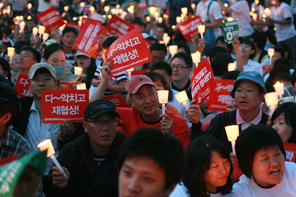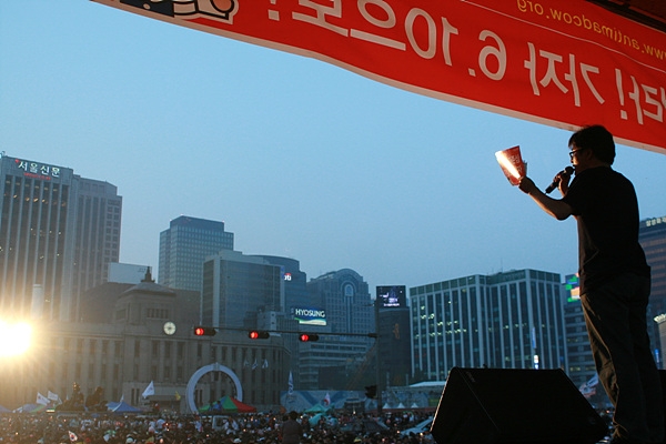 성남에서 왔다고 자신을 소개한 한 시민은 무대 위에 올라 이렇게 말했다. 하지만 이명박 대통령은 전날 국민의 이런 요구에 "재협상은 더 큰 문제를 유발한다"고 얘기했다. 시민은 "국민 건강보다 '더 큰 문제'가 대체 무엇이냐. '막가파'도 이런 '막가파'가 없다"고 반박해 참석한 시민의 환호를 받았다.