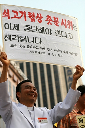 '한반도 대운하 지지 국민운동본부'의 사무총장이라는 최옥석 목사는 "쇠고기 협상 촛불 시위는 이제 중단해야 한다고 생각합니다"라고 쓰인 피켓을 들고 시위를 벌이고 있었다.