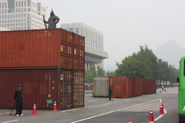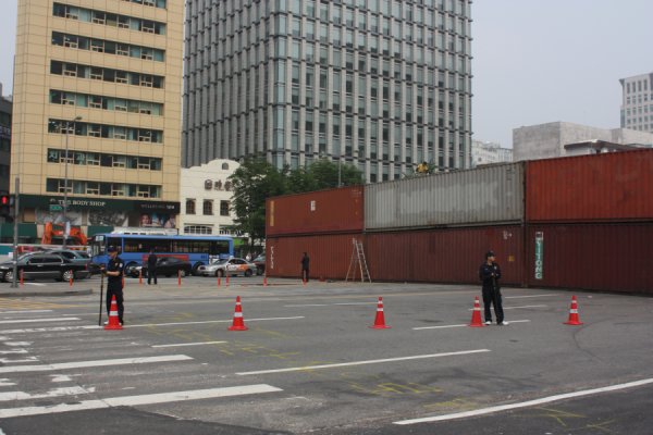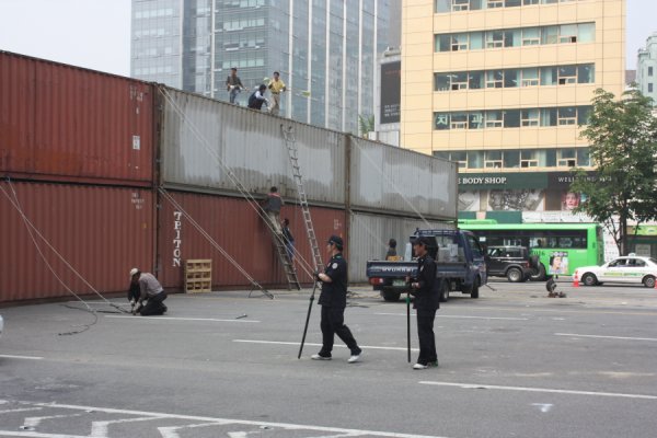 경찰은 이날 새벽 1시께부터 세종로 사거리에 대형 컨테이너 박스 20여개를 동원해 거대한 벽을 쌓았다. 방어벽 설치를 위해 컨테이너 박스가 동원된 것은 지난 2005년 부산 에이펙 행사 이후 처음이다. 당시 시민사회단체 등은 이라크 파병 반대 등을 이유로 미국 부시 대통령 체포조 등을 꾸려 격렬한 반세계화 시위를 벌였다.
