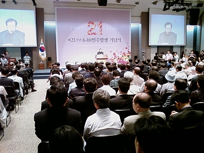 | 국민 여러분께 올리는 글 6월 10일 민주항쟁 21주년을 맞는 뜻 깊은 날입니다. 무엇보다도 선열들의 고귀한 뜻과 유업을 기리며 오늘의 자유민주주의 실현을 위해 몸 바치며 최선을 다한 선후배 동지들과 벗들의 노고를 기억하며 제사 드리는 자세로 정화과정을 거쳐 성찰의 기도를 올립니다. 몸과 마음이 함께하는 기억의 시간입니다. 기억은 과거를 "바로 지금 여기에서" 재현하여 시공을 넘어 한 눈으로 역사를 깨닫게 하는 길잡이며, 이를 토대로 현실을 직시하고 아름다운 미래를 지향하고 창출하는 인간이 지닌 고유능력입니다. 때문에 민주화운동기념사업회는 과거 선열들의 삶을 기억하며 이 뜻을 계승 심화시켜 발전하기 위해 설립되었습니다. 민주주의는 바로 국민이 나라의 주인이라는 역사의식의 확인으로, 수천여년을 통해 모든 사람의 마음에 뿌리내리고 확인된 공유적 가치입니다. 민주주의는 무엇보다도 바른 인간관, 바른 공동체관, 바른 역사관을 요구합니다. 이것이 바로 6.10민주항쟁의 정신이며 민주화운동기념사업회의 존재이유입니다. 첫째, 물론 사람에게 먹는 것이 가장 중요합니다. 그러나 우리 선조들은 먹는 것보다 더 중요한 정신과 도덕의 가치를 강조했습니다. 이 가르침과 삶은 먹는 것에 마음과 정신과 영혼을 담아 친교를 나누게 하였습니다. "사람이 빵으로만 사는 것이 아니라 하느님의 입에서 나오는 모든 말씀으로 산다."(마태오 4,4;신명기8,3)는 성서의 가르침도 선조들의 정신적 유산을 뒷받침해줍니다. 선조들이 남겨준 가르침은, 늘 보존해야 할 질서이기 때문입니다. 온통 경제제일주의로 치닫고 있는 현실에서 우리는 이 교훈을 새삼 깊이 되새겨야 합니다. 둘째, 우리는 바른 공동체관을 지녀야 합니다. 사람은 이웃과 함께 공동선을 위해 살아가는 사회적 존재입니다. 공동선은 개인과 가정, 단체가 보다 쉽고 완전하게 자기완성을 이루는 사회생활 조건의 총체입니다. 공동선은 또한 인간이 주체이며 과정이며 목적이 되는 사회적 질서입니다. 사실 사람은 십인십색으로 서로 다르지만 자유와 책임, 양심과 정의에 기초한 공동선 안에서 언제나 일치와 조화를 이루어야 합니다. 이 조화는 외적 성장이전에 내적 발전을 확증합니다. "정의에 기초하지 않은 국가는 강도집단에 불과하다"는 성아우구스띠노의 가르침에 따라 우리는 이성과 상식, 자연법에 기초한 공권력을 확인합니다. 우리는 다양성 안에서의 일치를 확인하며 부정과 비리, 거짓과 불의에 항거하여 투쟁하고 청렴결백과 지혜, 사랑과 정치적 신념으로 모든 사람의 이익을 위해 헌신할 것을 다짐하고 증거 해야 합니다. 선열들의 가르침은 전 세계에 이르도록 "모두", "골고루", "함께" 하는 삶의 필요성과 당위성을 일깨워줍니다. 셋째, 바른 역사관을 지녀야 합니다. 역사는 과거, 현재, 미래를 한 눈으로 통찰하는 종합적 학문입니다. 헤겔의 역사철학이론과 슐라이어마허의 해석학적 순환 이론을 새삼 거론하지 않더라도 우리는 상식과 도덕에 기초한 공유적 가치를 늘 확인하고 있습니다. 우리는 모두 한 결 같이 국가와 민족을 위해 이바지하겠다고 공언하고 있습니다. 그러나 이완용, 송병준과 같은 매국노도 같은 말을 했습니다. 역사의 물줄기를 바로 세우고 바른 역사관과 식별력을 지녀야 할 이유가 바로 여기에 있습니다. 청소년의 시대입니다. 우리시대의 청소년들은 사람이 모일 때 항상 나타내는 물리적 과시보다는 마음에 호소하는 친교와 평화를 보여줍니다. 청소년들이 광장에 모여 촛불을 켜고 외칩니다. 청소년들은 하늘의 뜻을 외치는 목소리입니다. 하느님의 마음을 전하는, 그 분의 확성기입니다. 어둠을 이기는 빛입니다. 시대의 목소리, 하늘의 목소리입니다. 우리는 그들이 밝히는 빛을 향하여 나아가야 합니다. 우리는 마음으로는 그들과 하나입니다. 많은 분들과 같이 우리도 청소년들의 이 모습 속에서 한국사회의 미래, 아니 인간 모두가 찾고 실현해야 할 진리와 아름다운 정체성을 보고 배워야 합니다. 또한 우리는, 그들의 목적을 향한 진지함과 열정 그리고 포용과 여유 안에서 아름다운 역동성과 창조성을 확인합니다. 그러나 젊은이들의 이 순수성을 왜곡하는 거짓된 언론을 이 기회에 우리는 국민들과 함께 엄하게 꾸짖고자 합니다. 같은 어법으로 80년 광주희생과 87년 6월 민주항쟁을 헐뜯고 매도했던 언론주범들이 바로 그들입니다. 언론의 회개를 진심으로 촉구합니다. 우리는 촛불을 켜든 젊은이들의 모습에서 6.10민주항쟁의 현실적 의미와 교훈을 확인합니다. 이들의 외침과 호소가 있는 그대로 대통령과 선의를 지니고 진리를 찾는 모든 사람들에게 전달되기를 바라며 기도합니다. 오늘의 사회적 갈등과 난국을 극복하기 위해 참으로 큰 지혜가 필요합니다. 민심이 천심이라 했습니다. 청소년들이 주축이 된 촛불문화제의 노래와 함성이 바로 시대의 소리, 하늘의 소리입니다. 우리 모두 그들의 소리를 듣고 그 뜻을 존중하고 실천에 옮겨야 합니다. 대통령께서는 바로 이 소리에 귀를 기울여주시기 바랍니다. 이것이 바로 오늘 6.10민주항쟁 21주년의 주제입니다. 다윗왕에게 