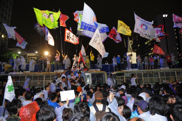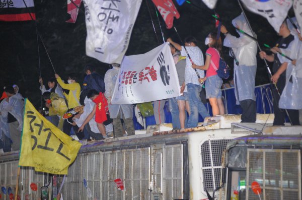 촛불을 든 두 여대생이 나눈 짧은 대화에는 냉소와 비웃음이 섞여 있었다. 그들의 눈은 그리스를 덕지덕지 발라놓은 경찰 버스 앞에 만들고 있는 '국민토성'에 향해 있었다. 모래주머니를 쌓아 만든 '토성'은 어느덧 청와대 방향 광화문 사거리를 빈틈없이 차단한 경찰 버스의 높이만큼 높아져 있었다. 21일 오후 11시, 서울 광화문 사거리의 풍경이었다.