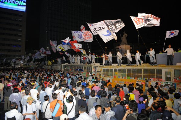 그러나 집회 참가자들이 한 귀로 듣고 흘려 버리는 '경고'는 공허할 뿐이었다. 대신 야유, 비난, 농담으로 대응하는 시민들의 목소리가 여기저기서 터져나왔다. "차나 빼", "트럭은 죄가 없다. 트럭을 풀어줘라.", "이순신을 석방하라. 전경을 석방하라."