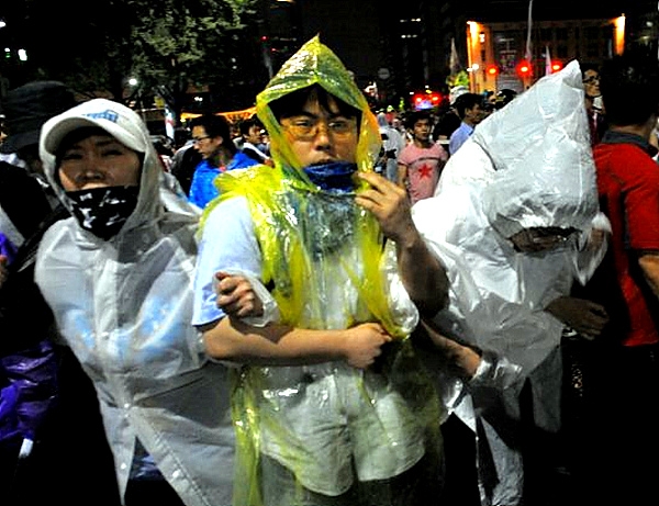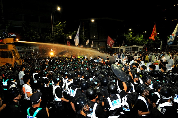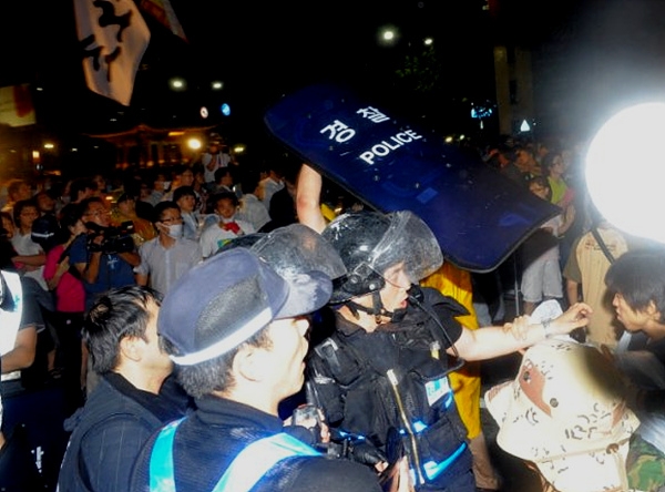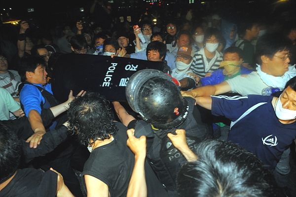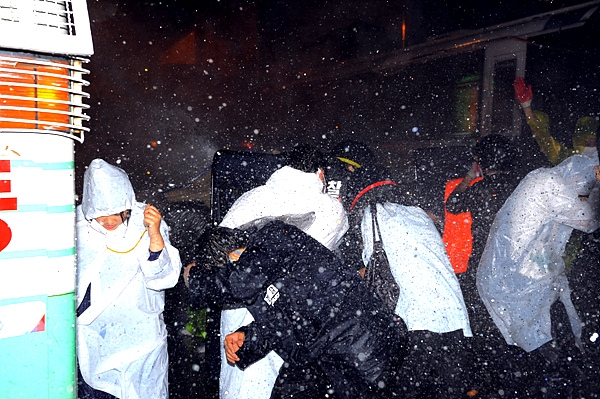 26일 새벽 서울 광화문 네거리. 경찰의 진압 태도는 이전과 확연히 달랐다. 2시께부터 시민들을 향해 밀려든 경찰병력은 물대포와 방패을 앞세워 순식간에 시민들을 청계광장 방향으로 밀어냈다. 이 과정에서 경찰은 여전히 물대포를 시민들을 향해 직사했으며, 일부 전의경들은 방패 날을 세워 시민들을 가격하기도 했다.