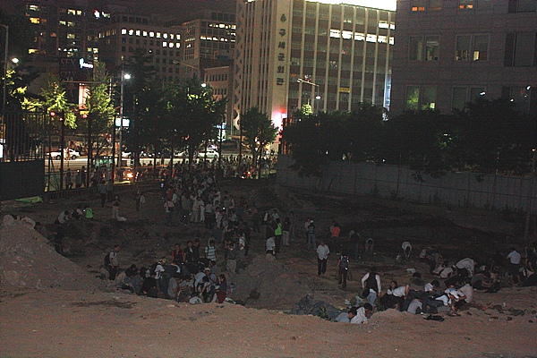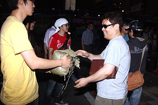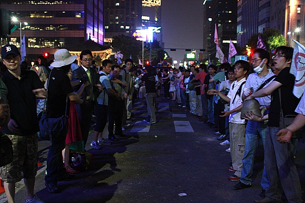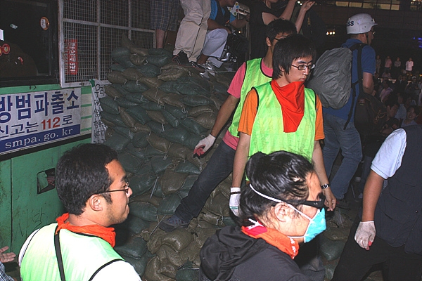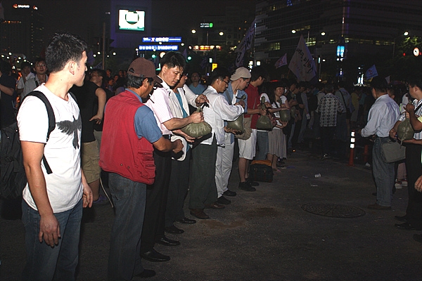 간혹 모래주머니의 전달이 뜸해지면 만세 부르기 파도타기로 몸을 푸는 등 제법 흥겨운 모습이다. 촛불시위 50여 일 만에 새로 생겨난 풍경이다.