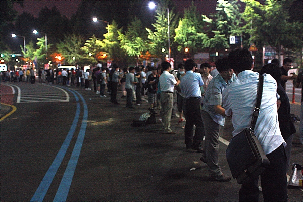 오후 10시 현재 세종로 이순신 동상 앞 경찰버스 앞에는 모래주머니가 차곡차곡 쌓이고 있다. 시민들은 두 줄로 연도해 모래주머니를 나르고 있는데, 이 '인간 컨베이어벨트'는 이순신 동상 앞에서 서대문 쪽 신문로 흥국생명 빌딩 앞까지 이어지고 있다.