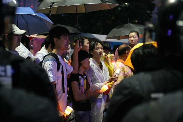 길 위에 가만히 촛불을 들고 서 있는 사람은 무조건 '범죄'를 저지를 소지가 있다는 단정이었다. 인도 위에서 시민들과 경찰들은 계속 말다툼을 벌였다. 그러는 동안에도 일명 '확성녀'로 불리는 여자 경찰은 방송을 통해 계속 "경찰의 지시에 따르지 않으면 즉각 현행범으로 체포하겠다"고 경고했다.