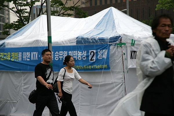 이튿날 KTX 여승무원들도 서울역 앞에 천막을 쳤다. 비정규직 노동자를 '보호'하겠다며 만든 비정규직 관련법이 시행 1년을 맞던 날이었다. 그리고 이 날은 비정규직 보호법이냐 비정규직 해고법이냐는 논란 속에 관련법이 100인 이상 300인 미만 사업장으로 확대 적용되는 날이었다.