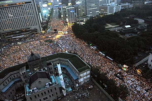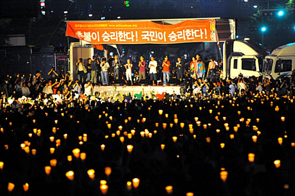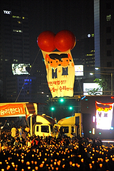 가장 눈에 띄는 풍경은 가족 단위 참가자다. 자녀와 함께 나온 많은 시민이 서울광장에 야외용 돗자리를 펴고 촛불을 든 뒤 '헌법 제1조', '광야에서', '아침이슬' 등을 따라 부르며 집회에 참여했다. 주최 측은 '미친 소 미친 정부 공안 정국 2MB'라고 적힌 대형 애드벌룬을 공중에 띄웠고, 선언문을 발표한 뒤 '전면 재협상, 촛불이 승리한다'는 애드벌룬을 또 띄웠다.