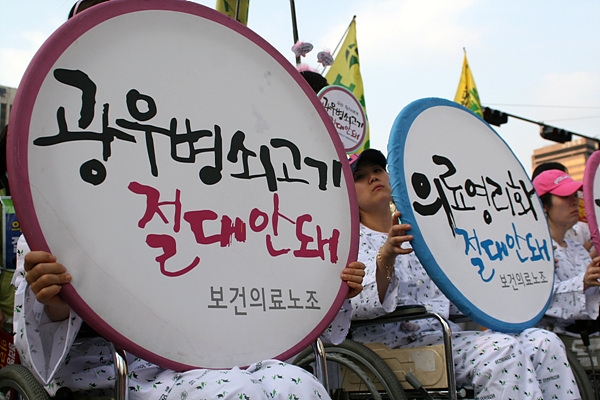필수유지업무제도는 필수공익사업장의 파업 시 일정 인원을 반드시 남겨둬야 하는 제도다. 홍명옥 보건의료노조 위원장은 이와 관련 "이미 보건의료노조는 지난 10년의 산별노조 경험과 병원이라는 특수성으로 인해 자체적인 기준이 존재했었다"며 "정부와 사 측이 이를 무시하고 노조의 파업권을 무력화하는 수단으로 악용한다면 지키지 않겠다"고 경고했다.