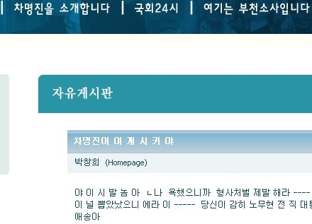차 대변인은 "사이버 공간은 인격적 소화불량자들이 휘젓고 다니면서 함부로 배설이나 하는 곳이 아니다"면서 "정보와 생각이 자유롭게 오고 갈 수 있도록 사이버 공간에 널부러져 있는 배설물들을 청소해야 한다"고 말했다.