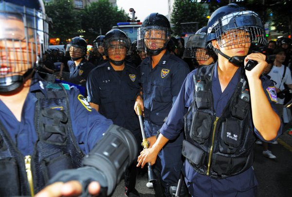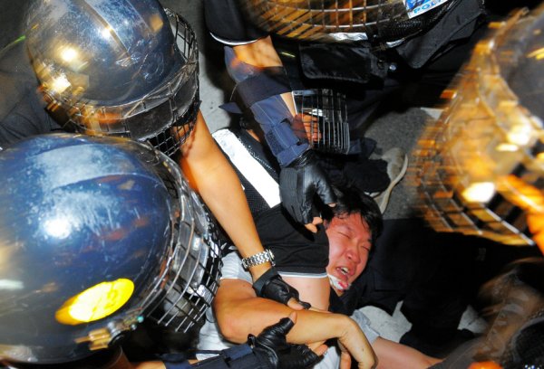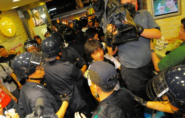 7시 50분경, 청계광장에 모여 있는 집회 참가자를 향해 세 방향에서 동시에 경찰 부대가 진격해 진압을 시도했다. 경찰은 깃발을 들고 있는 이들을 집중적으로 연행했으며, 주변에서 항의하는 이들까지 막무가내로 연행했다. 비명소리와 카메라의 플래시가 사방에서 터졌다.