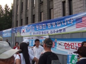 한국기독교총연합회는 '촛불집회 중단, 독도 침탈 일본 규탄, 금강산 관광객 피살 사건 단호한 대처, 한미동맹강화' 등을 주장하며 '나라사랑 한국교회 특별기도회'를 열었다. 이들은 성조기와 태극기를 나란히 붙인 애드벌룬을 광장 한가운데에 띄워 부시의 방한을 환영한다고 밝혔다. 이날 참석한 1만여 명의 시민들 역시 태극기와 성조기 모형 깃발을 나란히 들고 참석했다. 참가자들은 50~60대 연령층이 대부분이었으며, 조갑제 <월간조선> 전 대표가 나와 "우리는 미국을 반대하는 죄를 저질렀다"며 촛불 집회를 성토하기도 했다. 해병대전우회가 군복을 입고 인도를 행진하는 등 한대 청계광장에서 열리는 촛불 집회 참가자들과의 충돌이 예상되기도 했으나, 이날 집회는 별다른 사고없이 마무리됐다. ■ 부시 대통령이 도착한 경기도 성남 서울공항 앞에서는 부시 대통령의 방한을 반대하는 집회가 진행될 예정이었으나, 경찰의 봉쇄로 열리지 못했다. 바로 전 날인 4일 국가인권위원회는 경찰의 집회 금지 결정이 부당하다며 긴급구제를 결정했지만, 경찰은 이를 정면 무시했다. 평화와 통일을 여는 사람들 관계자 등이 공항 근처에서 피켓을 들고 있었다는 이유로 무차별 연행됐다. 이에 반해 한국자유총연맹 회원 수백 명은 서울공항 입구에서 태극기와 성조기를 흔들며 부시 방한을 환영했다. 부시 대통령은 한국 경찰의 경호 가운데 서울시내 방향으로 차량으로 이동했다. |