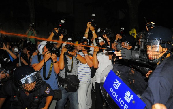 언론에 대한 통제는 말할 것도 없었다. 경찰은 카메라를 든 기자들 앞에서도 아랑곳하지 않고 물대포를 발사했다. 연행 장면을 찍으려 하는 카메라는 노골적으로 제지당했다. 한 경찰은 진압이 벌어지는 봉쇄선 안으로 들어가려는 <프레시안> 기자에게 "프레시안은 안 됩니다"라며 막아서기도 했다. 또 진압 과정에서 <경향신문> 기자도 연행될 뻔한 것으로 알려졌다.