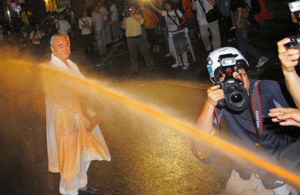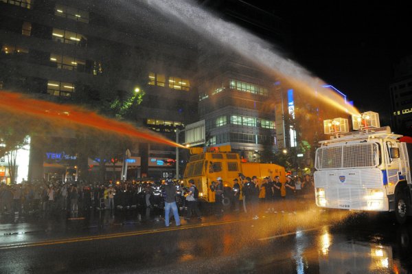 색소 섞인 물대포 발사…경찰 "도로교통법 위반이라서"