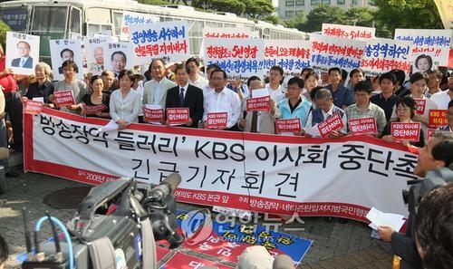 '방송장악 네티즌탄압저지 범국민행동'은 이날 오전 9시 200여 명이 모인 가운데 '방송장악 들러리 KBS 이사회 중단 촉구 긴급 기자 회견'을 열었다. 최문순, 천정배 민주당 의원과 문국현 창조한국당 대표, 심상정, 노회찬 진보신당 공동대표 및 이수호 민주노동당 최고위원 등이 이 자리에 함께 했다.