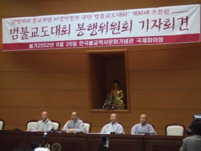 '범불교도 대회 봉행 위원회'는 26일 서울 종로구 한국불교역사문화기념관 국제회의장에서 기자 회견을 열고 "정부는 불교계에 대한 기만과 우롱을 중단하라"고 밝혔다. 위원장을 맡고 있는 원학 스님은 "어제와 오늘 청와대와 문화체육관광부에서 발표한 내용은 대단히 미흡한 것으로 매우 실망스럽다"며 "2000만 불자들이 범불교도 대회를 지속적으로 개최해도 좋다고 말한 것으로 이해하겠다"고 질타했다.