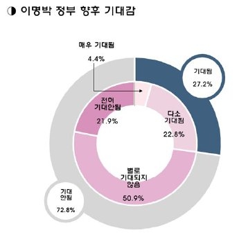 한국사회여론연구소(KSOI)가 지난 달 20~25일 정치분야 전문가 114명(학계 50명, 언론계 56명, 기타 8명)을 대상으로 여론조사를 벌인 결과 이명박 정부의 국정운영에 대해 '기대된다'는 응답은 27.2%로 '기대되지 않는다'는 응답에 훨씬 못 미쳤다.