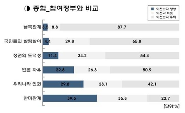 이 중 남북관계에 대한 부정평가가 87.7%로 압도적이었고, '경제'를 내세웠던 이명박 정부임에도 불구하고 '살림살이가 이전보다 후퇴했다'는 부정평가가 65.7%에 이르렀다. '언론 자유'도 절반이 넘는 50.9%가 "후퇴했다"고 응답했고, 정권의 도덕성(54.4%), 인권(42.1%)의 '후퇴' 응답률도 '향상' 응답률을 압도했다.