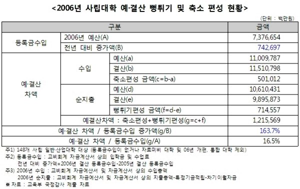 등록금넷, 한국대학교육연구소는 2006년 전국 148개 사립대학의 예·결산 자료를 분석한 결과 총 1조2156억 원의 차액이 발생했다고 밝혔다. 이중 수입이 축소 편성된 금액은 5010억 원이었으며, 지출이 부풀려 편성된 금액은 7146억 원이었다.