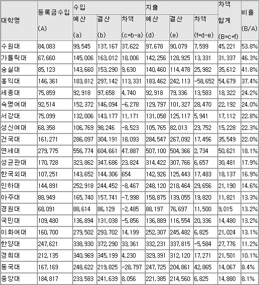 예·결산 차액 1조2156억 원…등록금 수입액의 16.5%