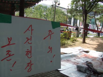 9일 새벽 서울 종로 조계사 옆 우정총국 공원에서 벌어진 피습 사건을 목격한 김모(27) 씨는 울분을 터트렸다.