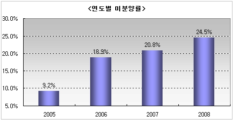 닥터아파트 조사에 따르면, 2005년 전국에서 분양(아파트, 주상복합)한 총 29만2532가구 중 2만6975가구가 미분양 돼 9.2%의 미분양률을 보였다. 2006년과 2007년 꾸준히 증가추세를 보이더니 2008년(7월 기준)에는 총 11만933가구 분양물량 중 2만7231가구가 미분양 돼 24.5% 미분양률을 기록했다.