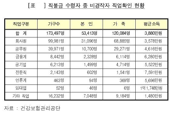 특히 회사원(10만여 명), 금융계(8442명), 의사·변호사 등 전문직(2143명), 언론계(463명) 인사들이 대거 포함된 점이 만천하에 공개됐다. 직불금을 탄 금융계 인사들의 평균소득은 6280만 원이었고, 전문직 평균소득은 7591만 원이었다. 평균소득 1억1748만 원의 임대업자 52명도 직불금을 타갔다.