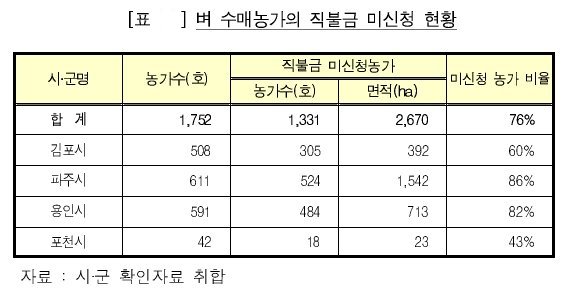 과정도 악랄하다. 감사원의 감사 결과를 보면 경기도 김포, 파주, 용인, 포천의 1752호의 농가 중 직불금을 신청하지 않은 농가가 1331호로 미신청 농가 비율이 무려 76%에 달했다. 개발 기대감이 높은 수도권으로 대부분의 농지가 도시에 거주하는 부재지주라는 점이 확인된 셈인데, 감사원은 "지주의 압력과 반대로 직불금 신청을 일부 누락하거나 아예 신청조차 하지 못한 것으로 확인 됐다"고 밝혔다. 지주가 우월적 지위를 이용해 더 큰 이익(투기)을 위해 약자인 농민의 직불금까지 수탈해간 셈이다.