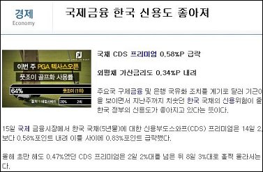 첫째, "15일 국제 금융시장에서 한국 국채(5년물)에 대한 신용부도스왑(CDS) 프리미엄이 14일 2.57%로, 13일보다 0.58% 내려 이틀 사이에 0.83%포인트 급락했다"는 것.
