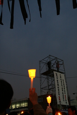 점점 더 깊어가는 가을 밤, 꼬박 여름 한 계절에 이어 다시 한 번 하늘로 올라간 김소연 분회장을 바라보며 지관 스님과 기륭전자 윤종희 조합원이 나직이 나눈 대화였다.