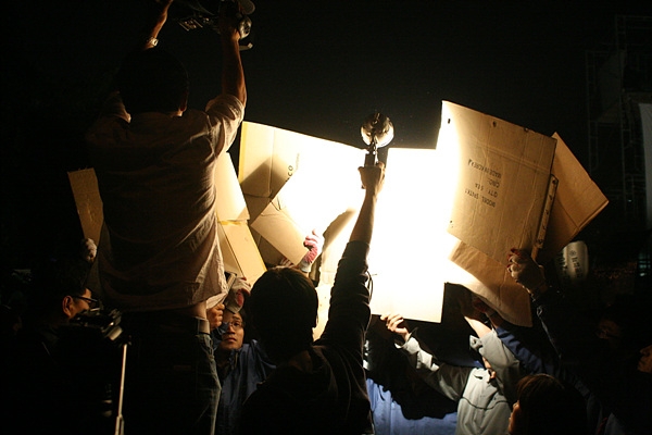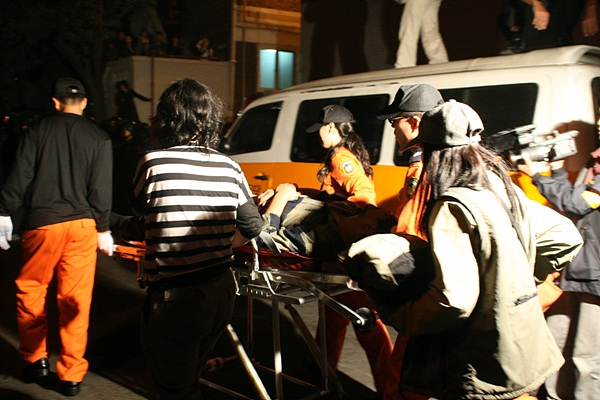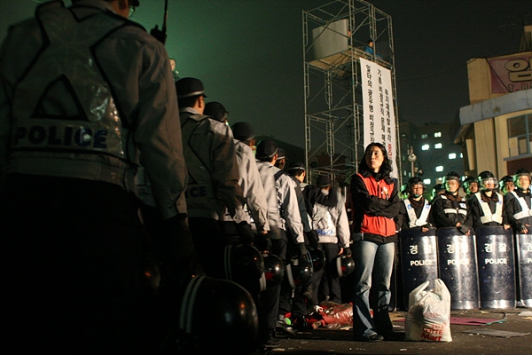 "용역이 내 사진기를 빼앗아 갔다"는 시민의 항의에도, 연행자를 접견하게 해달라는 변호사의 요구에도 모르쇠로 일관하던 경찰은 밤 12시가 넘으면서 추위를 달래기 위해 피운 작은 모닥불에는 20여 명이 집단으로 몰려 나와 소화기를 뿌려댔다.