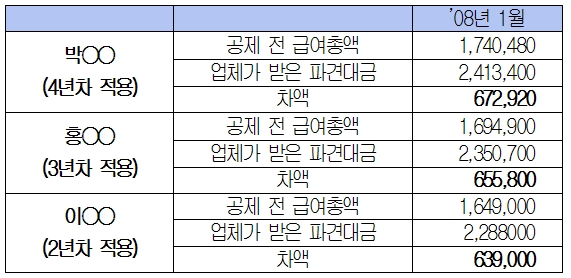 강남성모병원이 1인당 지급하는 돈을 놓고 보면, 4년차 파견 노동자 박 씨와 7년차 정규직 김 씨에게 들어가는 돈의 차이는 고작 3만 원 정도다. 병원이 지난 2002년 이후 같은 업무 정규직을 아예 뽑지 않았기 때문에 1~4년 차까지의 정규직-파견 노동자 임금 비교는 불가능하다.