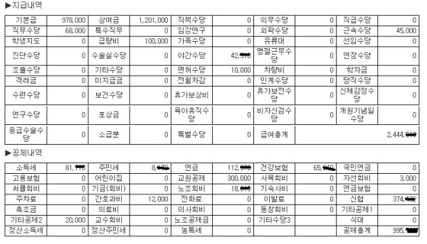 그렇다면 이 병원에서 박 씨와 같은 일을 하는 정규직의 임금은 얼마일까? 7년차 김미자(가명) 씨의 한 달 임금 총액은 244만4510원, 각종 공제액을 빼고 나면 144만8718원이다.