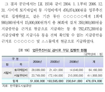 감사원 감사 자료에 따르면 공단은 정 이사장에게 1회에 90만 원에서 1500만 원까지 86회에 걸쳐 3억5090만 원을 지급상대방 및 지급사유를 전혀 확인할 수 없는 지급증만을 근거로 현금으로 지급했다는 것이다.